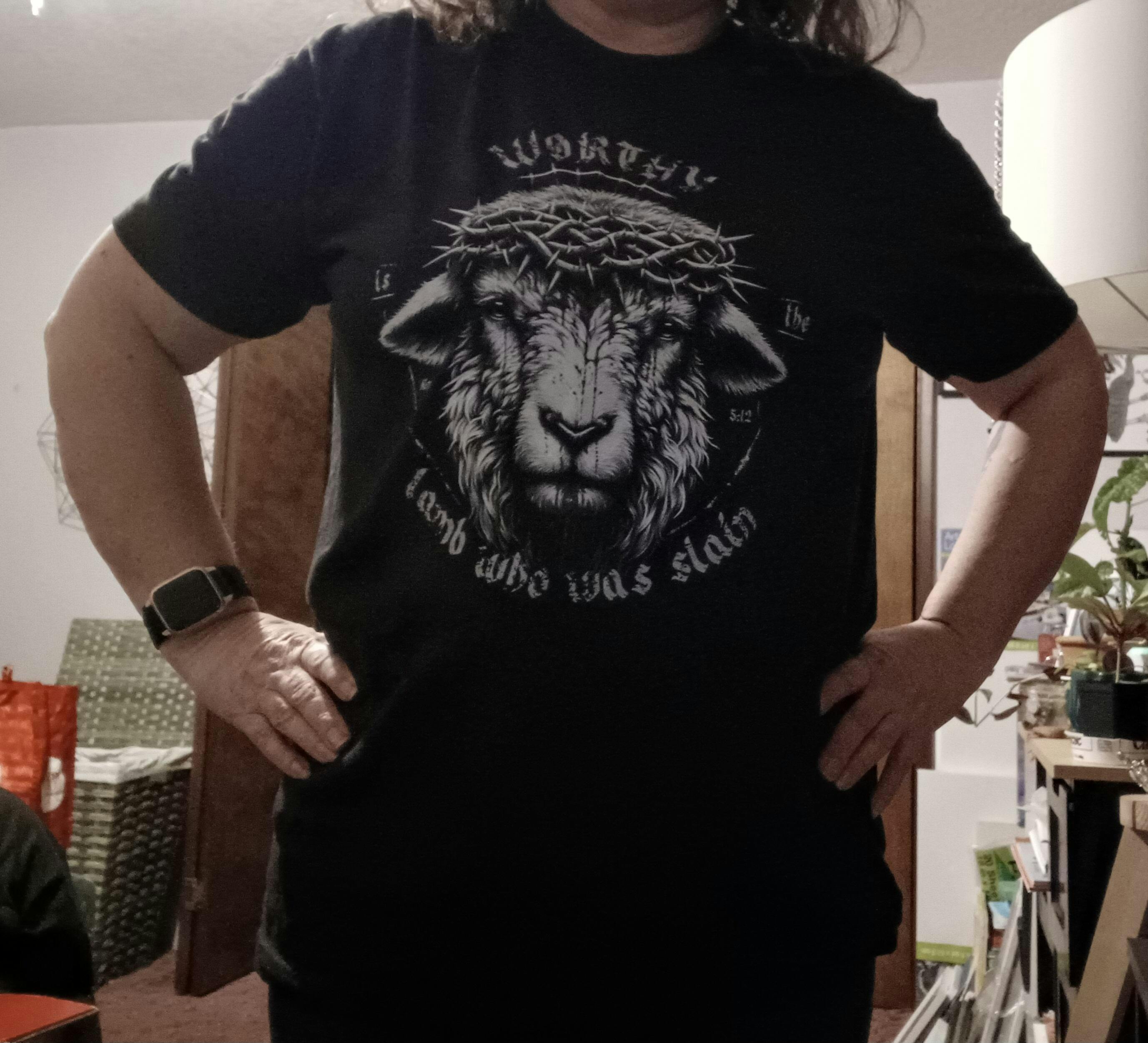 Design taken from the imagery found in Rev 5. Text on shirt reads "WORTHY is the lamb who was slain"